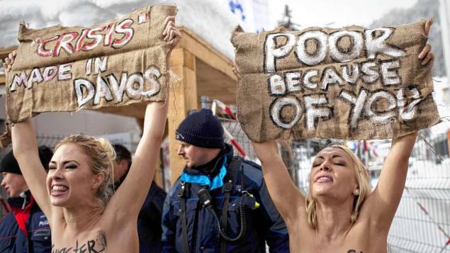 Seramai 40 orang hadir di Davos untuk protes perhimpunan World Economic Forum. Yang menjadi tumpuan adalah gadis yang tidak memakai pakaian protes sambil mengangkat kad menyuruh perhimpunan ini diberhentikan. Tiga orang gadis dari Ukraine ditahan kerana protes tersebut. Menurut mereka, perhimpunan ini akan menentukan ekonomi negara mereka yang semakin tidak stabil. Rakyat langsung tidak diberi peluang untuk menyuarakan apa-apa pendapat untuk membaik pulih ekonomi negara.