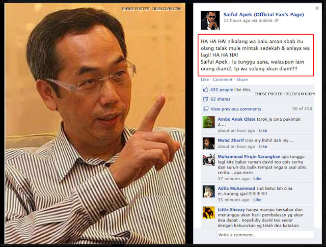 dah2x aku baru perasan lah..yang cakap dalam fb tu saiful apek lah dan bukan apek teo..tu mungkin saipul apek perli david teo sbb dulu masa bob masih hidup david teo tak pedulikan bob..so sbb sedih banget si apek perli lah david teo..so skrg kita tarak tau itu apek teo benar cakap serupa tidak sopan ma..juga kulang logik kalau olang aa sanggup hina olang suda mati..